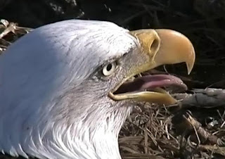 Drawn from a recent trip birding at a nearby lake, I have a scientific post for today. The topic: how birds cool down. I will start off by simply stating that birds do not sweat. So just how do they cool down? Take a close look at the screen shot posted below of one of the Decorah eagles, and see if you can guess the answer:
